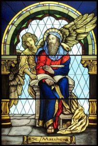 También hacemos notar que la inspiración de la Sagrada Escritura, vino a través de la mediación de los Santos Ángeles. En particular, los «Cuatro Seres Vivientes«, ángeles del coro de los querubines, vistos por el profeta Ezequiel (10, 9-21) y por San Juan, como se describe en el Libro del Apocalipsis (4, 6-7), que han sido asociados a los cuatro escritores del Evangelio. El ser viviente que tiene la apariencia de un hombre, se lo asocia a San Mateo. El que tiene la apariencia de un león está asociado a San Marcos. El que tiene la apariencia de un buey está asociado con San Lucas. Finalmente, el que tiene la apariencia de un águila en vuelo está asociado con San Juan.